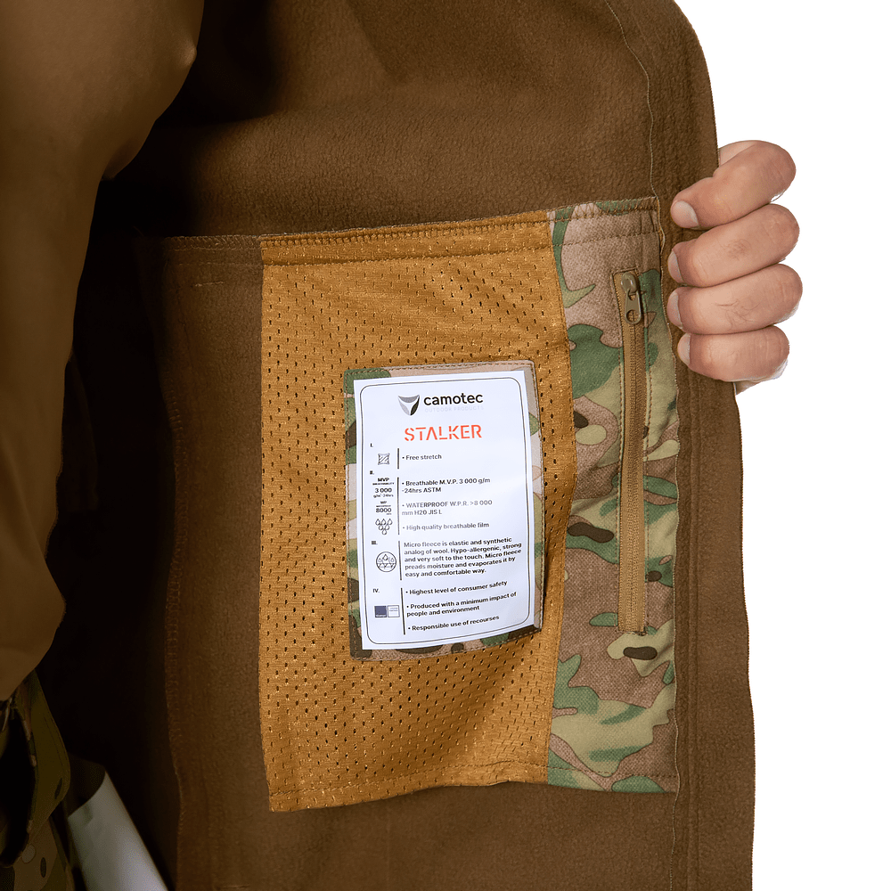 Куртка вироблена з оригінальної тканини SoftShell. Це легка, сучасна тканина зі справжньою безпоровою мембраною, яка складається з трьох шарів: мікрофліс який зберігає тепло; мембрана що захищає від вітру та вологи; еластичний поліестер із вологостійким просоченням, який захищає від пилу, бруду й вологи.