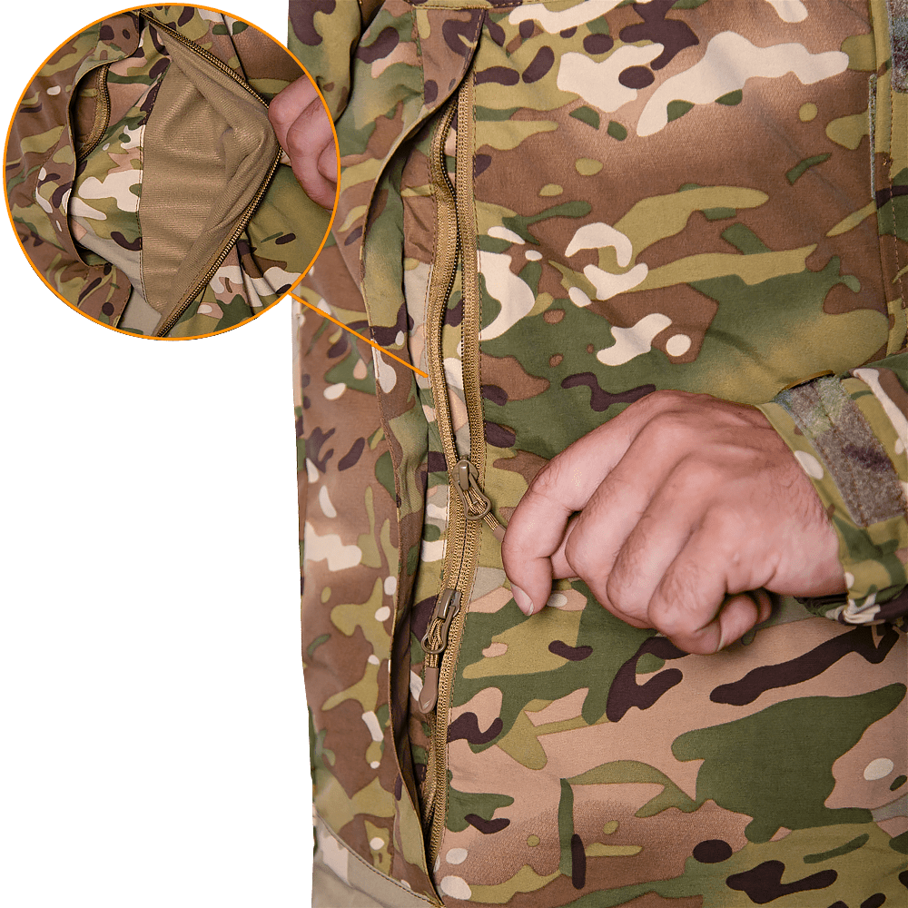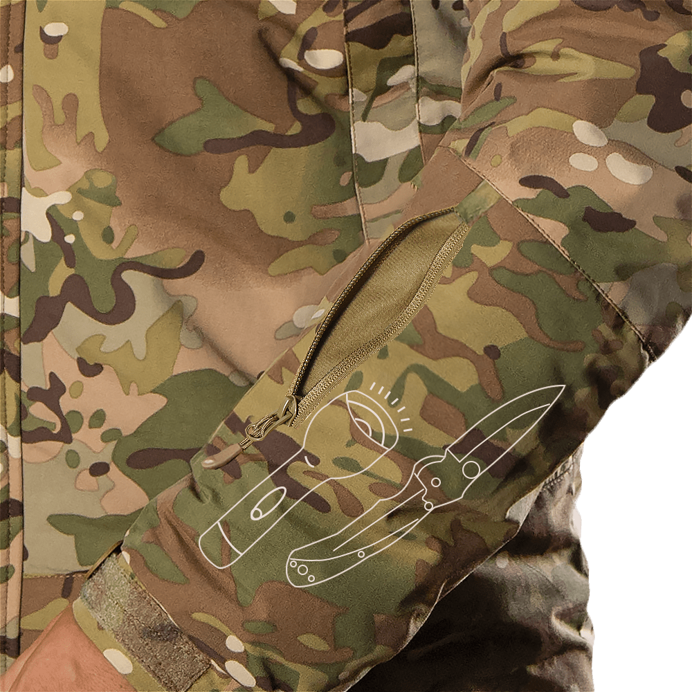 На рукавах та грудях розташовані липучки для кріплення патчів та шевронів.