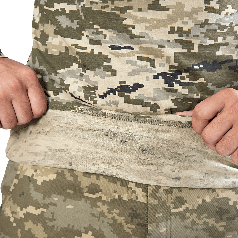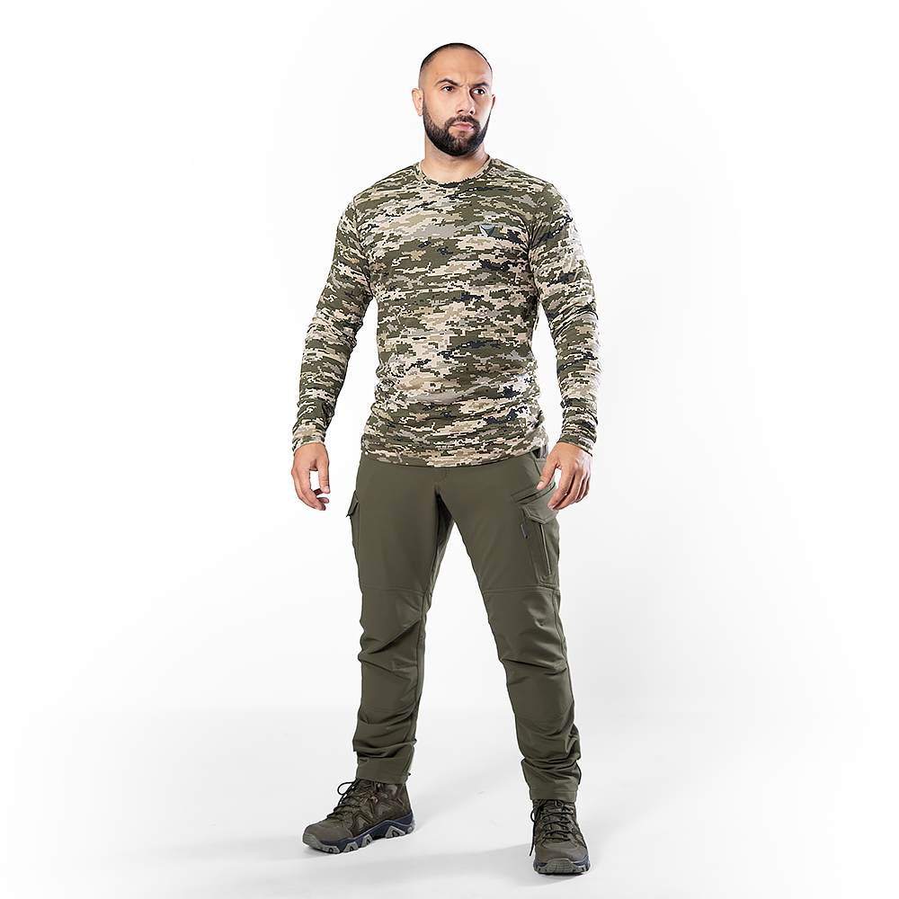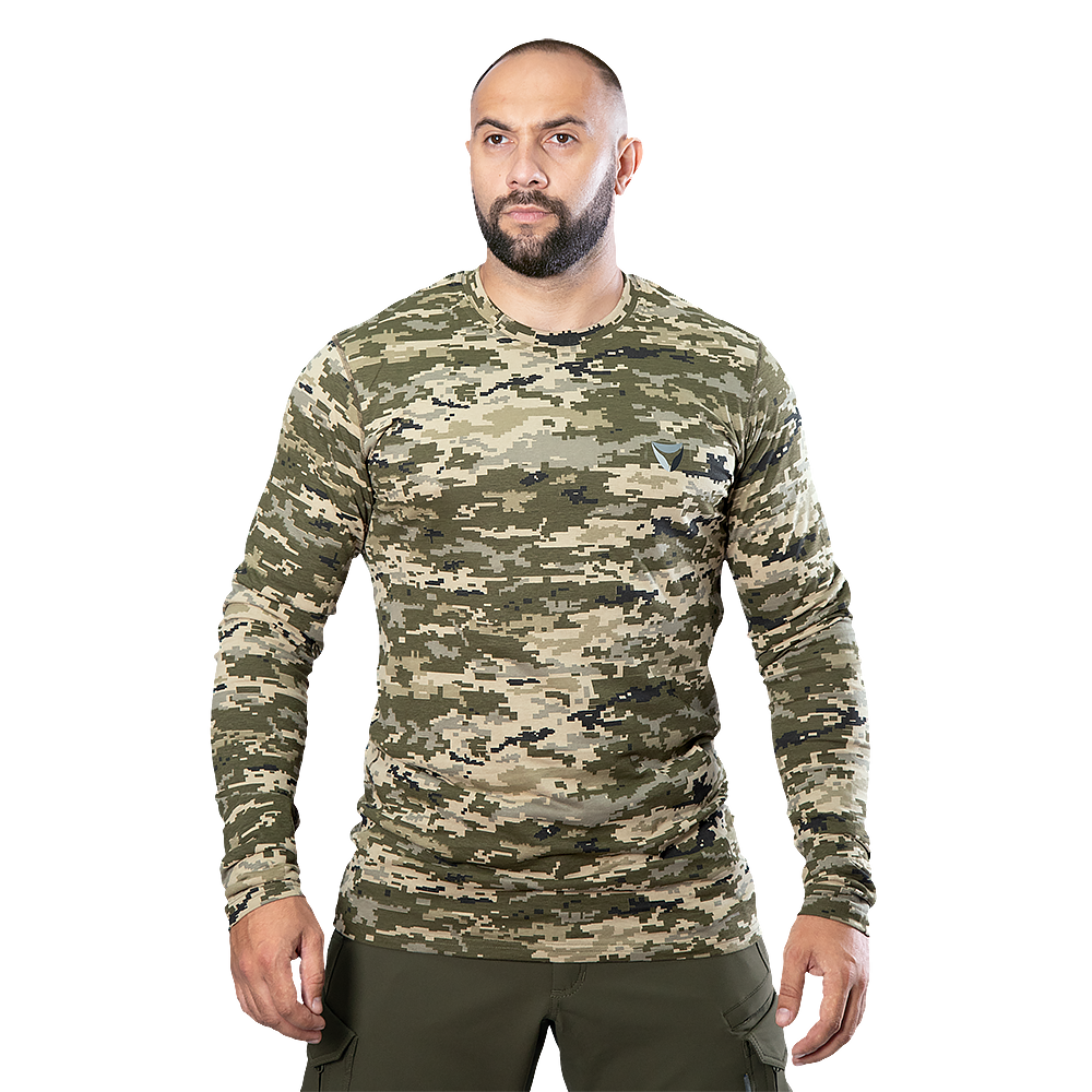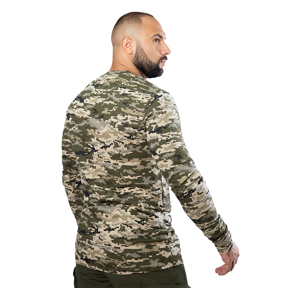 Універсальний лонгслів з натуральних матеріалів. Добре підійде для літньої, спекотної погоди. Завдяки камуфляжному забарвленню може використовуватись як формений одяг в охоронних та воєнізованих структурах.