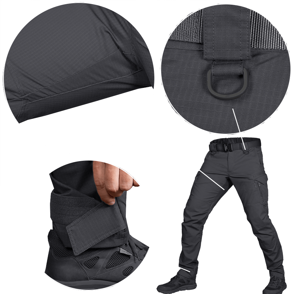 - Міцні широкі петлі, які витримають тактичний пояс з кобурою чи підсумками на ньому.