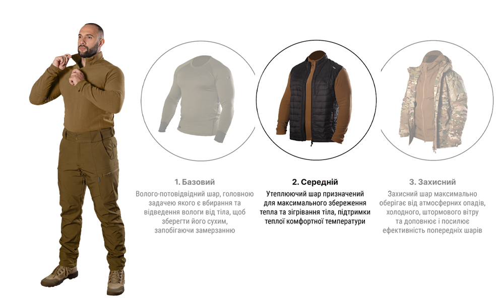 - Стоїте / чергування → термо + щільний фліс, за потреби додати легку жилетку/підстібка, в якості додаткового утеплення