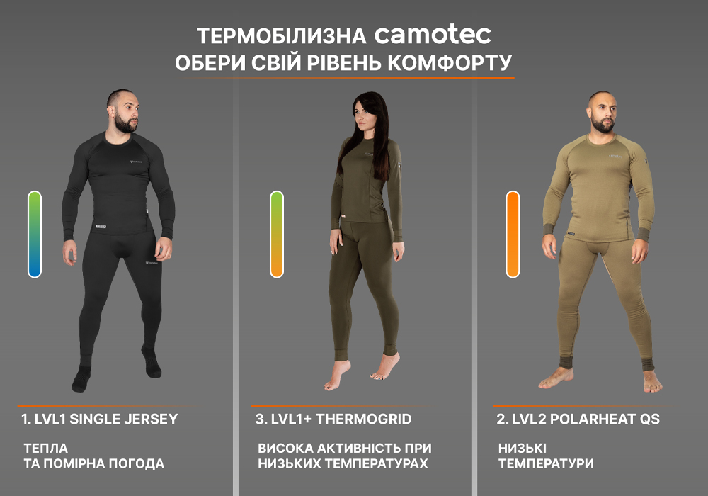 У Camotec ми створили кілька рівнів термобілизни, щоб ваші клієнти могли підібрати оптимальний варіант під свій ритм і температуру, а ви - легко інтегрувати продукцію у свій асортимент.